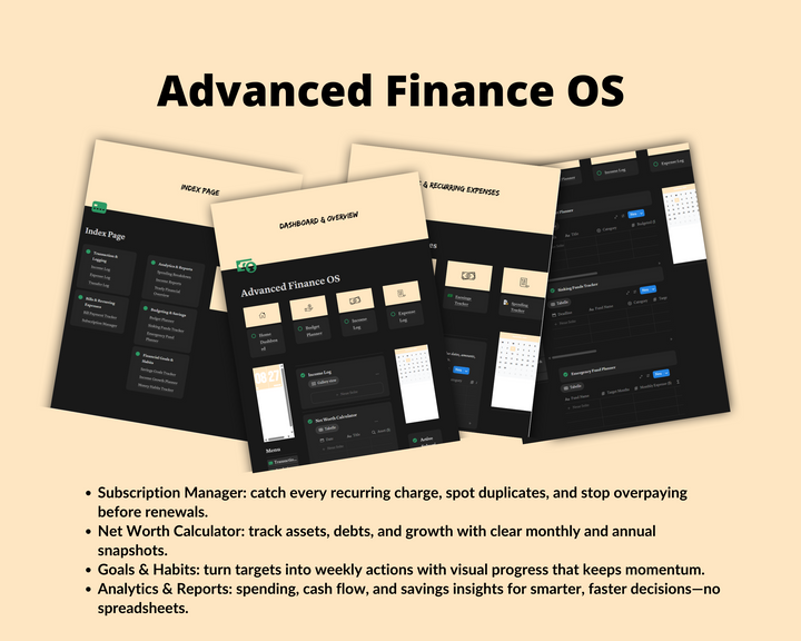 Advanced Finance OS isn’t just about managing money it’s about mastering it. With every dashboard, tracker, and report designed to give clarity, control, and insight, you’ll always know where you stand, make smarter financial moves, and grow your wealth with confidence.